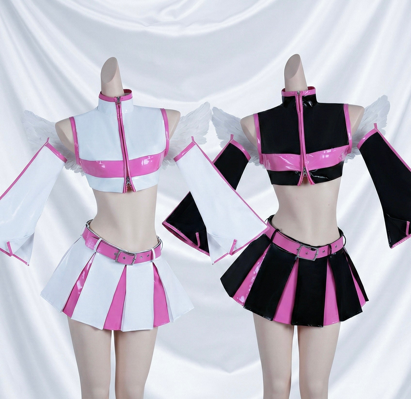 โข Complete Full Set: Includes the high-shine top, pleated skirt with integrated belt, matching detached flared sleeves, and garter accents.