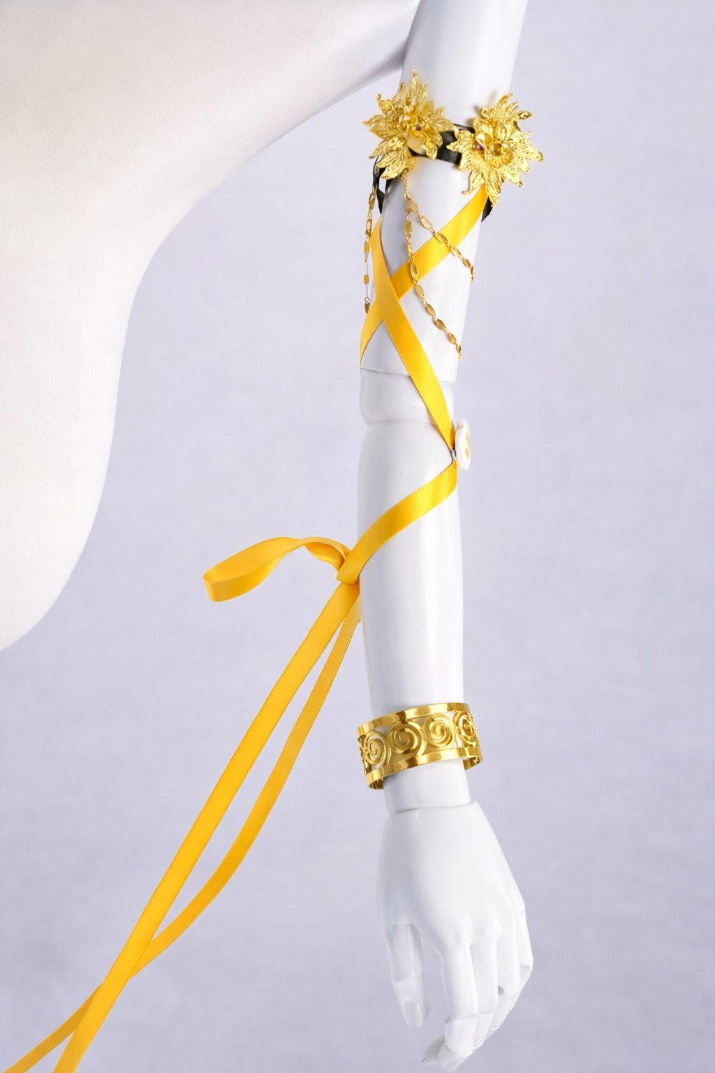 • Ornate Gold Accents: Heavily detailed with intricate gold-tone hardware, including a prominent fleur-de-lis style chest piece, a stunning high-neck choker with an amber-colored gem drop, and a decorative waist chain.